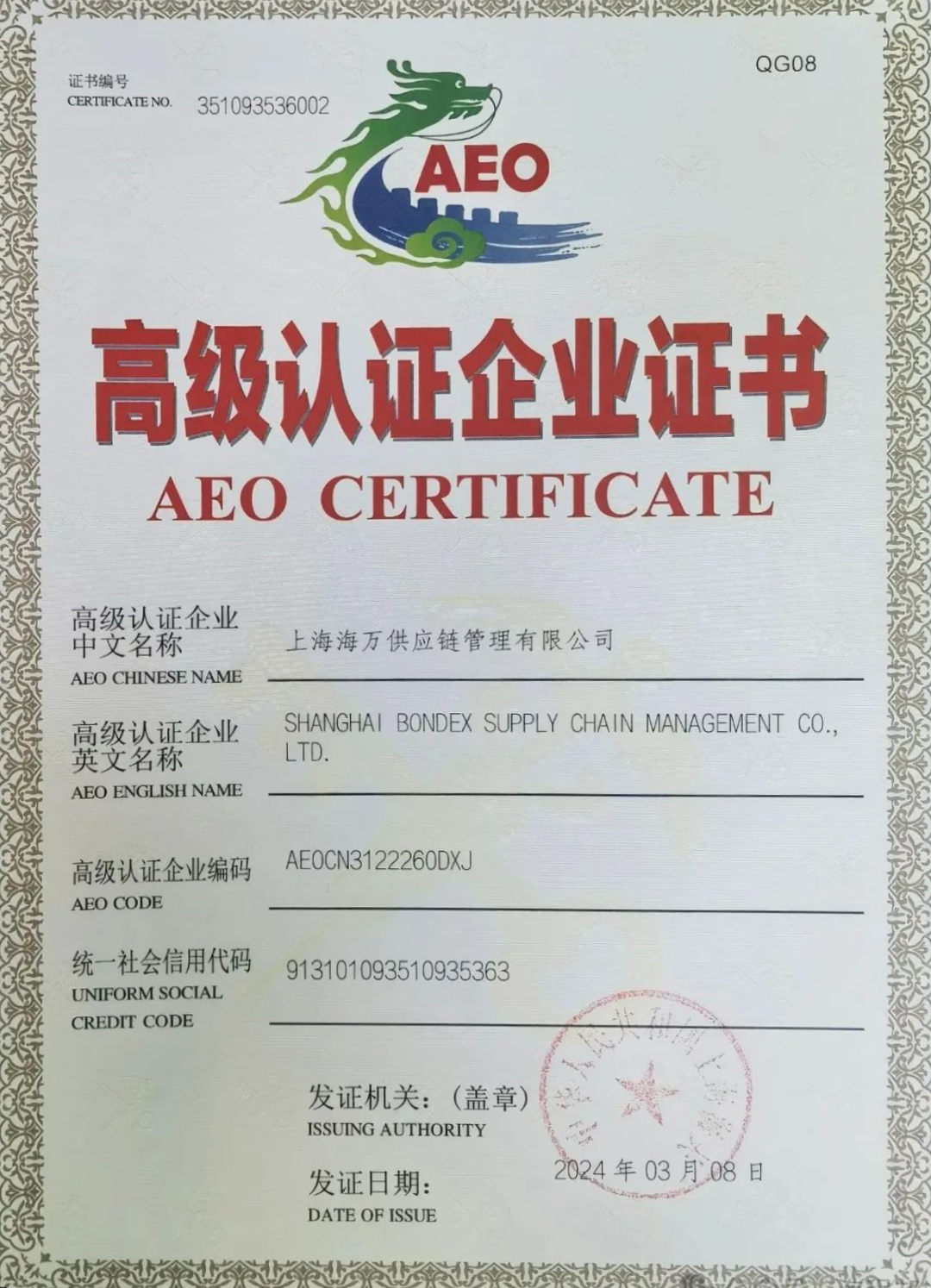 2024年3月8日,上海海萬供應鏈管理限公司順利通過海關AEO高級認證。AEO是海關授予企業的最高信用等級,獲得海關AEO高級認證資質,可享受到“海關最便捷、國內最優惠、國際最認可”三個維度的優惠措施。